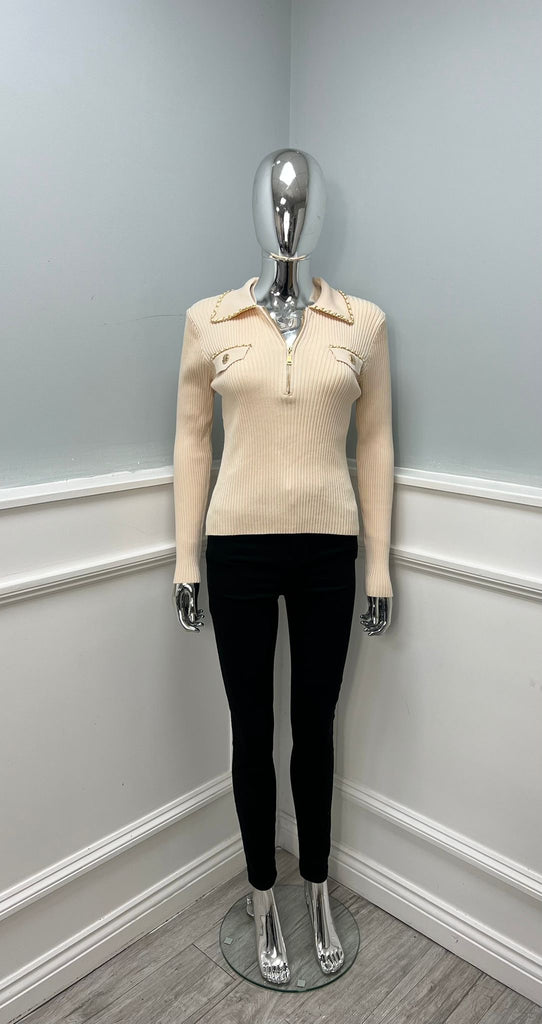 Light knit top with zip up neck detail, gold chain trim on collar and mock gold button pockets